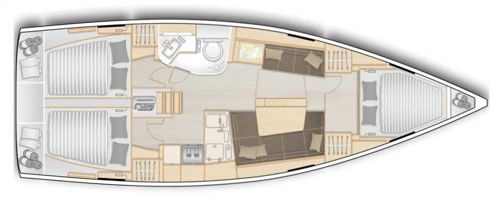 The three cabin version with one toilet. It’s possible to get another in the master cabin, but we didn’t want that. The two cabin version (master cabin + only one aft cabin) has a bigger kitchen and storage space in place of the starboard aft cabin.