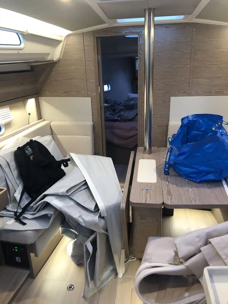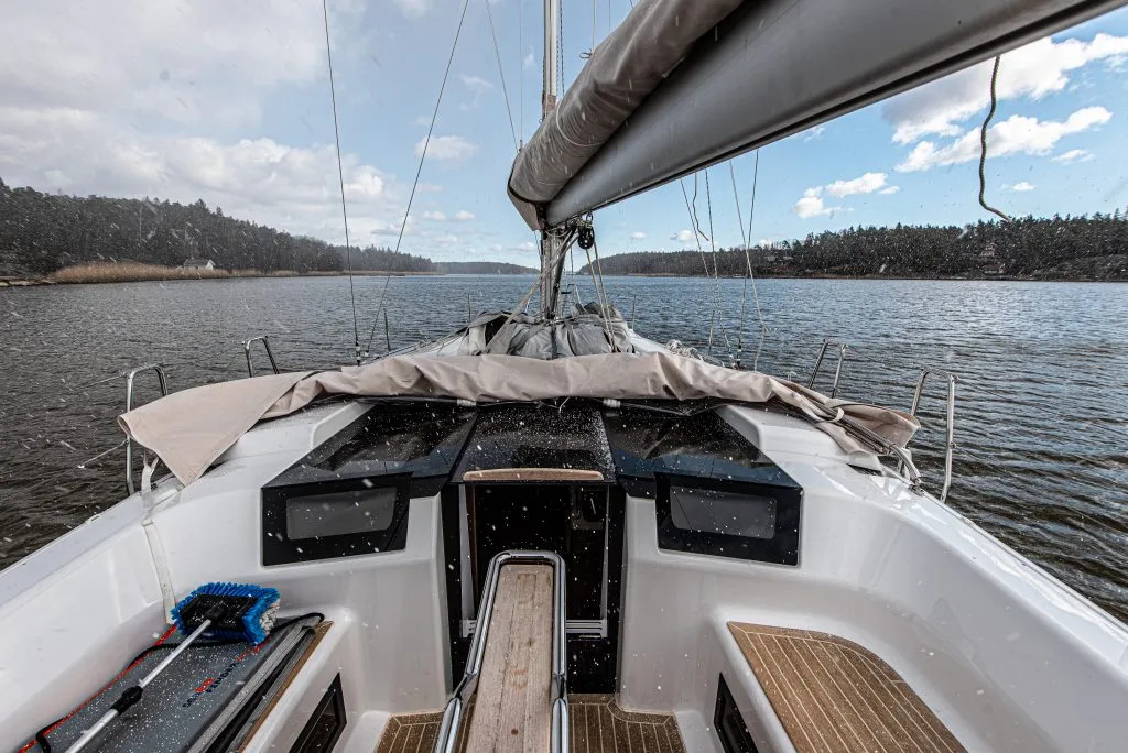 I had managed to get the jib up the day before, before dark, but after a quick breakfast, I continued with the rest of the work. Lazy bag up (a surprisingly smartly made system!). Mainsail up (had to check a couple of YouTube videos to figure out the battens and the MDS slider lock). And finally, sprayhood on.