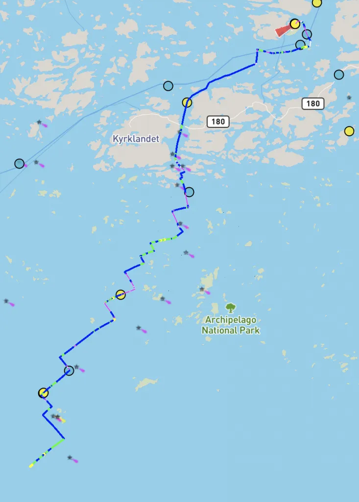 The screenshot below is of the first leg of our Turku – Visby trip (we spent one night at anchor before continuing), and if you head over to the site, you can click the yellow dots to see actual images and videos from the trip. (The blue dots are from our first season, one year earlier.)