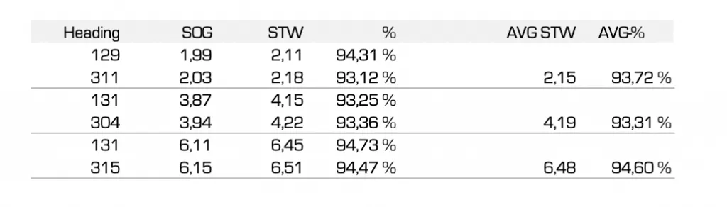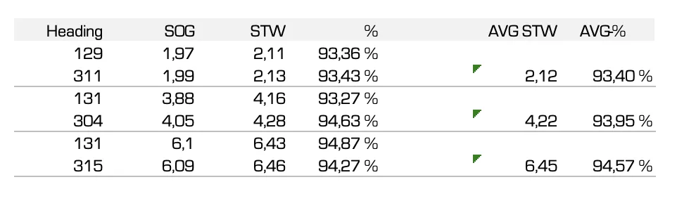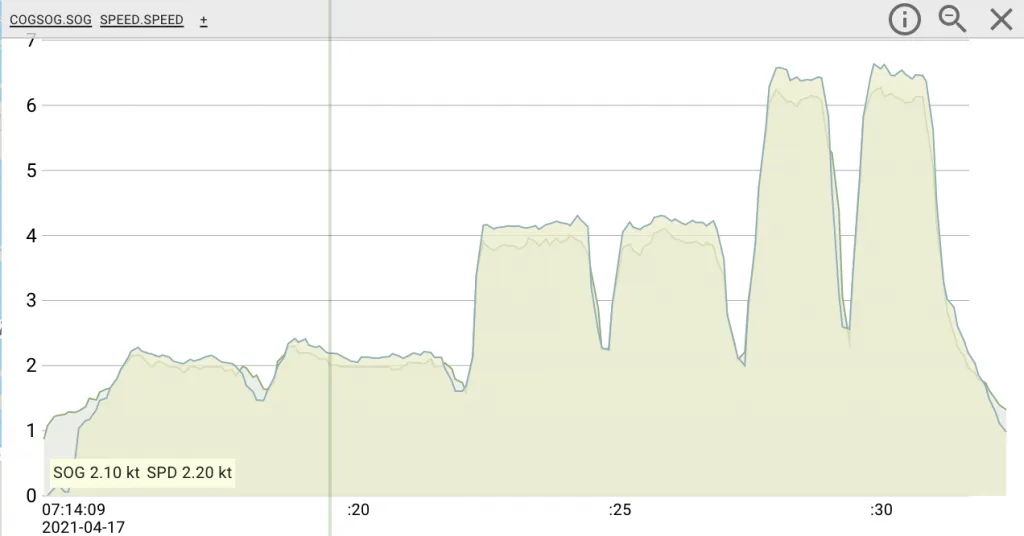 Here’s the data from that, and you immediately notice that the speed in water was slightly above SOG all the way.